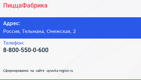 ПиццаФабрика по адресу ПиццаФабрика, 2, Онежская улица, Тельмановское городское поселение, Тосненский район, Ленинградская область, Северо-Западный федеральный округ, 187032, Россия в дальнейшем Организация, размещена в следующих категориях: