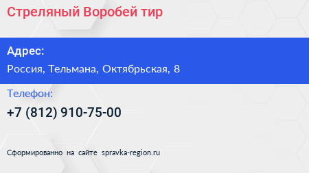 Стреляный Воробей, тир по адресу Торговый центр «Ока», Линия Обороны, Простоквашино, Колпино, Тельмановское городское поселение, Тосненский район, Санкт-Петербург, Северо-Западный федеральный округ, 187032, Россия в дальнейшем Организация, размещена в следующих категориях: