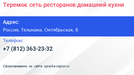 Теремок, сеть ресторанов домашней кухни по адресу Торговый центр «Ока», Линия Обороны, Простоквашино, Колпино, Тельмановское городское поселение, Тосненский район, Санкт-Петербург, Северо-Западный федеральный округ, 187032, Россия в дальнейшем Организация, размещена в следующих категориях: