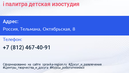 i-палитра, детская изостудия по адресу Торговый центр «Ока», Линия Обороны, Простоквашино, Колпино, Тельмановское городское поселение, Тосненский район, Санкт-Петербург, Северо-Западный федеральный округ, 187032, Россия в дальнейшем Организация, размещена в следующих категориях: