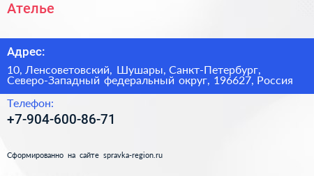 Ателье по адресу 10, Ленсоветовский, Шушары, Санкт-Петербург, Северо-Западный федеральный округ, 196627, Россия в дальнейшем Организация, размещена в следующих категориях: