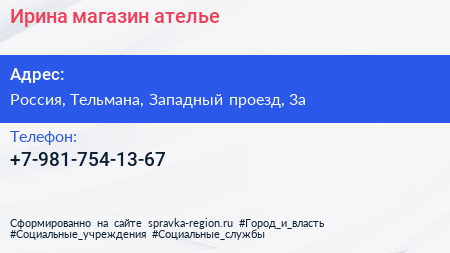 Ирина, магазин-ателье по адресу 3А, Западный проезд, Красная Звезда, посёлок имени Свердлова, Свердловское городское поселение, Всеволожский район, Ленинградская область, Северо-Западный федеральный округ, 188683, Россия в дальнейшем Организация, размещена в следующих категориях: