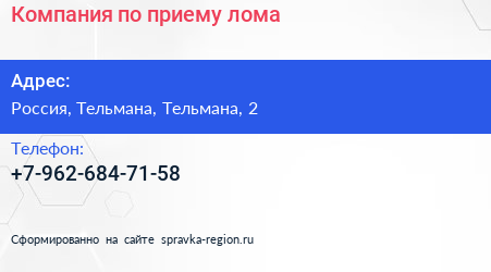 Компания по приему лома по адресу 52Б, Ленинградская улица, Ям-Ижора, Тельмановское городское поселение, Тосненский район, Ленинградская область, Северо-Западный федеральный округ, 187033, Россия в дальнейшем Организация, размещена в следующих категориях: