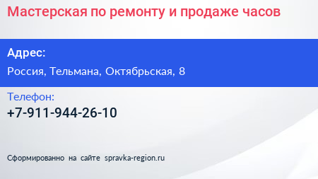 Мастерская по ремонту и продаже часов по адресу Торговый центр «Ока», Линия Обороны, Простоквашино, Колпино, Тельмановское городское поселение, Тосненский район, Санкт-Петербург, Северо-Западный федеральный округ, 187032, Россия в дальнейшем Организация, размещена в следующих категориях: