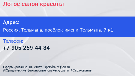 Лотос, салон красоты по адресу ВкусВилл, 7 к1, улица Тельмана, Тельмановское городское поселение, Тосненский район, Ленинградская область, Северо-Западный федеральный округ, 187032, Россия в дальнейшем Организация, размещена в следующих категориях: