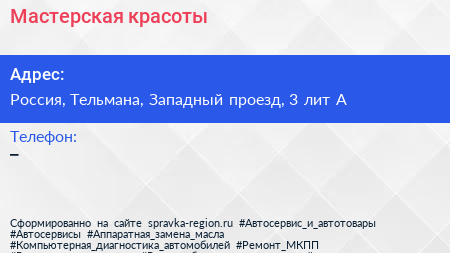 Мастерская красоты по адресу Мания, 3, Западный проезд, Красная Звезда, посёлок имени Свердлова, Свердловское городское поселение, Всеволожский район, Ленинградская область, Северо-Западный федеральный округ, 188683, Россия в дальнейшем Организация, размещена в следующих категориях: