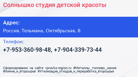 Солнышко, студия детской красоты по адресу Торговый центр «Ока», Линия Обороны, Простоквашино, Колпино, Тельмановское городское поселение, Тосненский район, Санкт-Петербург, Северо-Западный федеральный округ, 187032, Россия в дальнейшем Организация, размещена в следующих категориях: