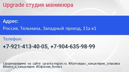 Upgrade, студия маникюра по адресу 11А к1, Западный проезд, Красная Звезда, посёлок имени Свердлова, Свердловское городское поселение, Всеволожский район, Ленинградская область, Северо-Западный федеральный округ, 188682, Россия в дальнейшем Организация, размещена в следующих категориях: