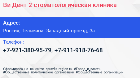 Ви-Дент 2, стоматологическая клиника по адресу 3А, Западный проезд, Красная Звезда, посёлок имени Свердлова, Свердловское городское поселение, Всеволожский район, Ленинградская область, Северо-Западный федеральный округ, 188683, Россия в дальнейшем Организация, размещена в следующих категориях: