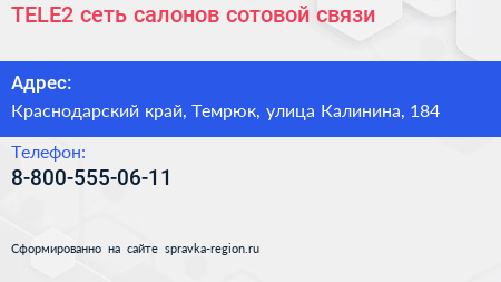TELE2, сеть салонов сотовой связи по адресу Краснодарский край, Темрюк, улица Калинина, 184 в дальнейшем Организация, размещена в следующих категориях: