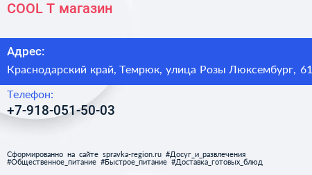 COOL`T, магазин по адресу Краснодарский край, Темрюк, улица Розы Люксембург, 61 в дальнейшем Организация, размещена в следующих категориях: