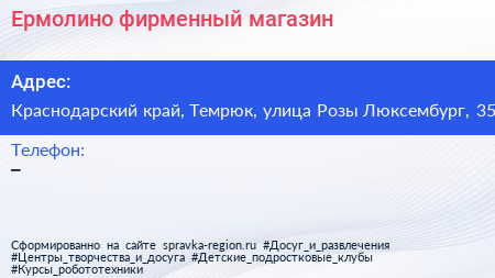 Ермолино, фирменный магазин по адресу Краснодарский край, Темрюк, улица Розы Люксембург, 35 в дальнейшем Организация, размещена в следующих категориях: