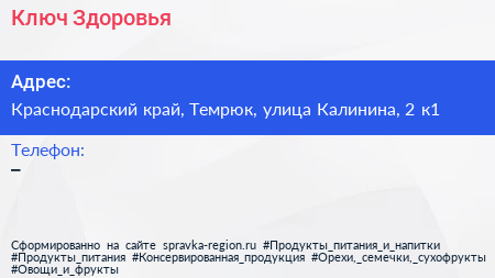 Ключ Здоровья по адресу Краснодарский край, Темрюк, улица Калинина, 2 к1 в дальнейшем Организация, размещена в следующих категориях: