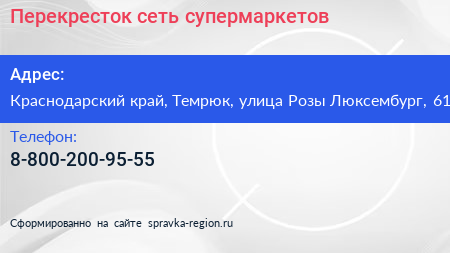 Перекресток, сеть супермаркетов по адресу Краснодарский край, Темрюк, улица Розы Люксембург, 61 в дальнейшем Организация, размещена в следующих категориях: