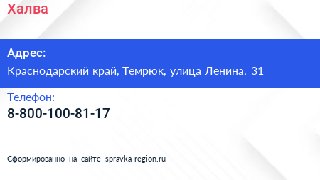 Халва по адресу Краснодарский край, Темрюк, улица Ленина, 31 в дальнейшем Организация, размещена в следующих категориях: