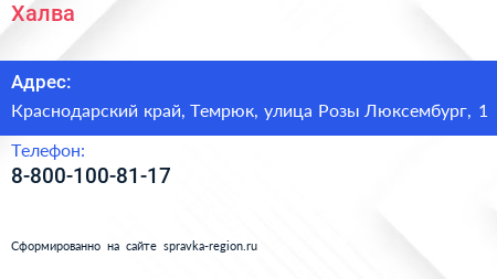 Халва по адресу Краснодарский край, Темрюк, улица Розы Люксембург, 1 в дальнейшем Организация, размещена в следующих категориях: