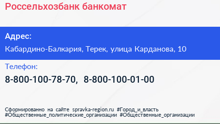 Россельхозбанк, банкомат по адресу Кабардино-Балкария, Терек, улица Карданова, 10 в дальнейшем Организация, размещена в следующих категориях:
