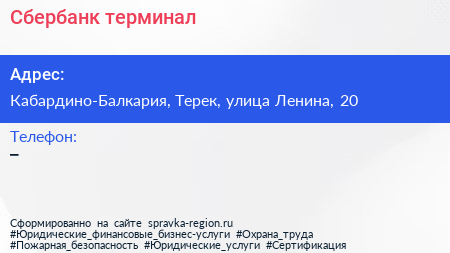 Сбербанк, терминал по адресу Кабардино-Балкария, Терек, улица Ленина, 20 в дальнейшем Организация, размещена в следующих категориях: