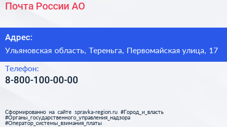 Почта России, АО по адресу Ульяновская область, Тереньга, Первомайская улица, 17 в дальнейшем Организация, размещена в следующих категориях: