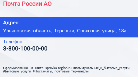 Почта России, АО по адресу Ульяновская область, Тереньга, Совхозная улица, 13а в дальнейшем Организация, размещена в следующих категориях: