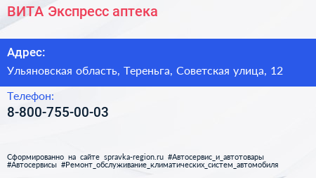 ВИТА Экспресс, аптека по адресу Ульяновская область, Тереньга, Советская улица, 12 в дальнейшем Организация, размещена в следующих категориях: