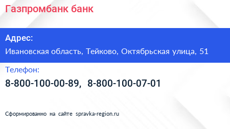 Газпромбанк, банк по адресу Ивановская область, Тейково, Октябрьская улица, 51 в дальнейшем Организация, размещена в следующих категориях: