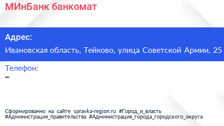 МИнБанк, банкомат по адресу Ивановская область, Тейково, улица Советской Армии, 25 в дальнейшем Организация, размещена в следующих категориях: