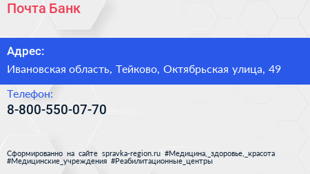 Почта Банк по адресу Ивановская область, Тейково, Октябрьская улица, 49 в дальнейшем Организация, размещена в следующих категориях: