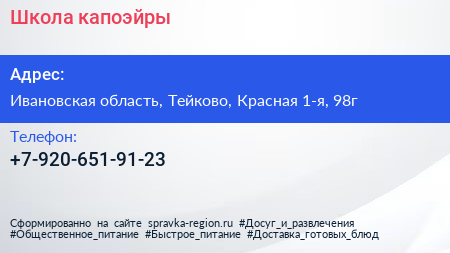Школа капоэйры по адресу Ивановская область, Тейково, Красная 1-я, 98г в дальнейшем Организация, размещена в следующих категориях: