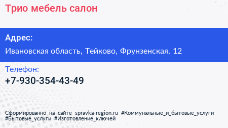 Трио мебель, салон по адресу Ивановская область, Тейково, Фрунзенская, 12 в дальнейшем Организация, размещена в следующих категориях: