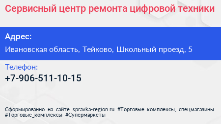 Сервисный центр ремонта цифровой техники по адресу Ивановская область, Тейково, Школьный проезд, 5 в дальнейшем Организация, размещена в следующих категориях:
