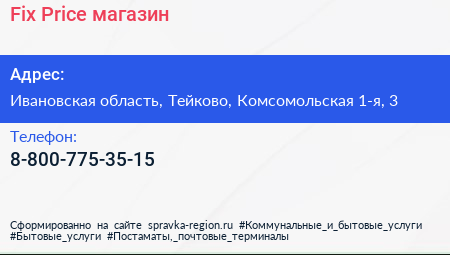 Fix Price, магазин по адресу Ивановская область, Тейково, Комсомольская 1-я, 3 в дальнейшем Организация, размещена в следующих категориях: