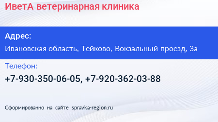 ИветА, ветеринарная клиника по адресу Ивановская область, Тейково, Вокзальный проезд, 3а в дальнейшем Организация, размещена в следующих категориях: