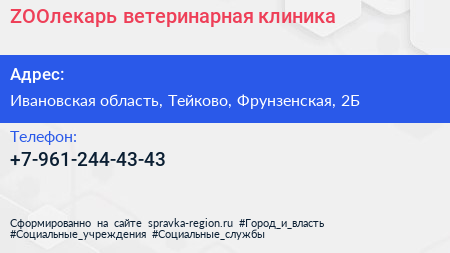 ZOOлекарь, ветеринарная клиника по адресу Ивановская область, Тейково, Фрунзенская, 2Б в дальнейшем Организация, размещена в следующих категориях:
