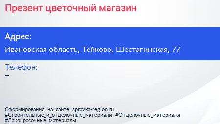 Презент, цветочный магазин по адресу Ивановская область, Тейково, Шестагинская, 77 в дальнейшем Организация, размещена в следующих категориях: