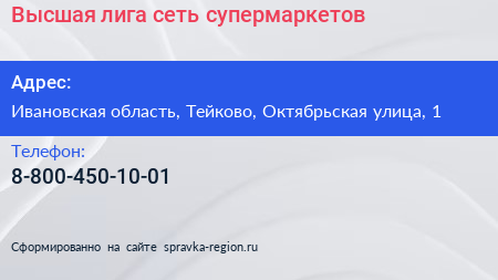 Высшая лига, сеть супермаркетов по адресу Ивановская область, Тейково, Октябрьская улица, 1 в дальнейшем Организация, размещена в следующих категориях: