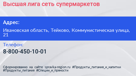Высшая лига, сеть супермаркетов по адресу Ивановская область, Тейково, Коммунистическая улица, 21 в дальнейшем Организация, размещена в следующих категориях: