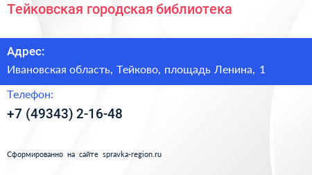 Тейковская городская библиотека по адресу Ивановская область, Тейково, площадь Ленина, 1 в дальнейшем Организация, размещена в следующих категориях:
