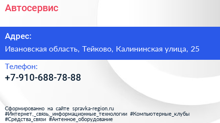 Автосервис по адресу Ивановская область, Тейково, Калининская улица, 25 в дальнейшем Организация, размещена в следующих категориях: