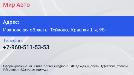 Мир-Авто по адресу Ивановская область, Тейково, Красная 1-я, 98г в дальнейшем Организация, размещена в следующих категориях: