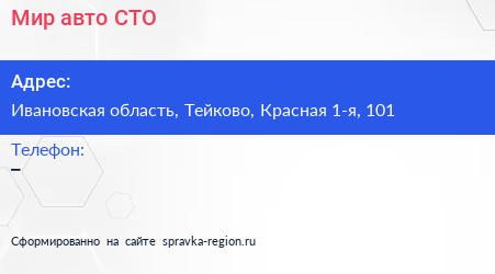 Мир авто, СТО по адресу Ивановская область, Тейково, Красная 1-я, 101 в дальнейшем Организация, размещена в следующих категориях: