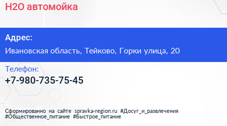 H2O, автомойка по адресу Ивановская область, Тейково, Горки улица, 20 в дальнейшем Организация, размещена в следующих категориях: