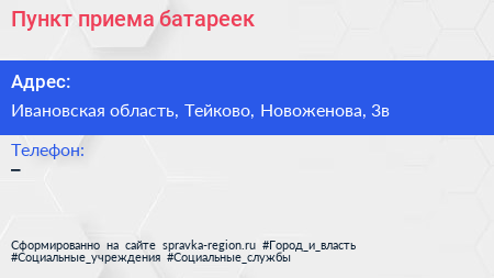 Пункт приема батареек по адресу Ивановская область, Тейково, Новоженова, 3в в дальнейшем Организация, размещена в следующих категориях: