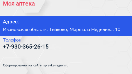 Моя аптека по адресу Ивановская область, Тейково, Маршала Неделина, 10 в дальнейшем Организация, размещена в следующих категориях:
