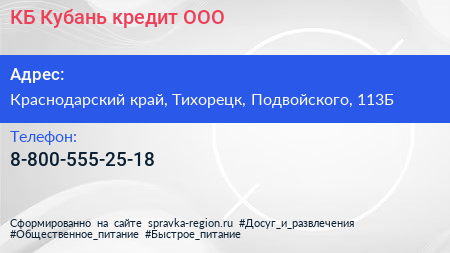 КБ Кубань кредит, ООО по адресу Краснодарский край, Тихорецк, Подвойского, 113Б в дальнейшем Организация, размещена в следующих категориях: