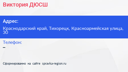 Виктория, ДЮСШ по адресу Краснодарский край, Тихорецк, Красноармейская улица, 30 в дальнейшем Организация, размещена в следующих категориях:
