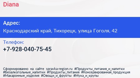 Diana по адресу Краснодарский край, Тихорецк, улица Гоголя, 42 в дальнейшем Организация, размещена в следующих категориях: