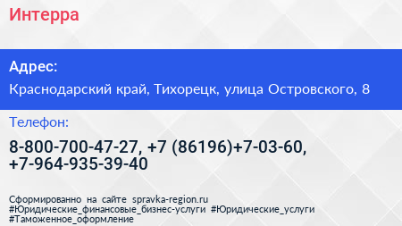 Интерра по адресу Краснодарский край, Тихорецк, улица Островского, 8 в дальнейшем Организация, размещена в следующих категориях: