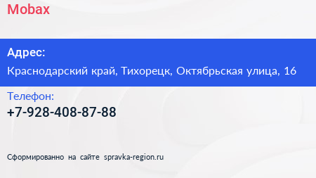 Mobax по адресу Краснодарский край, Тихорецк, Октябрьская улица, 16 в дальнейшем Организация, размещена в следующих категориях: