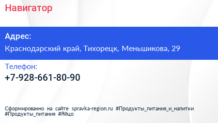 Навигатор по адресу Краснодарский край, Тихорецк, Меньшикова, 29 в дальнейшем Организация, размещена в следующих категориях: